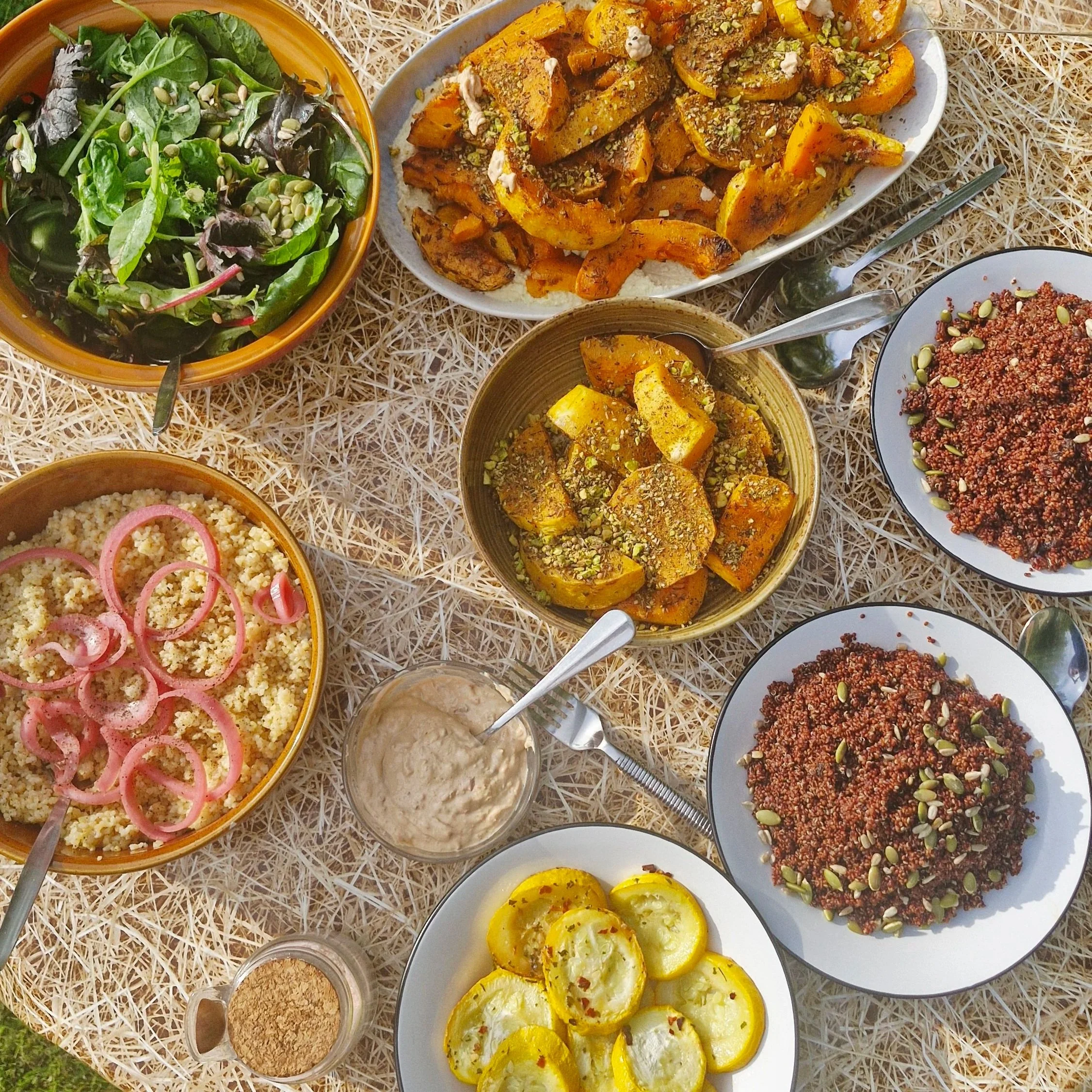 “I love creating a Sunday brunch. Sundays are relaxed and most people on retreat have a bond by this meal. The table is full of colour and multiple dishes such as tofu scramble, yummy breads, richly flavoured veg and usually a nice surprise such as ferments, which pops with colour.